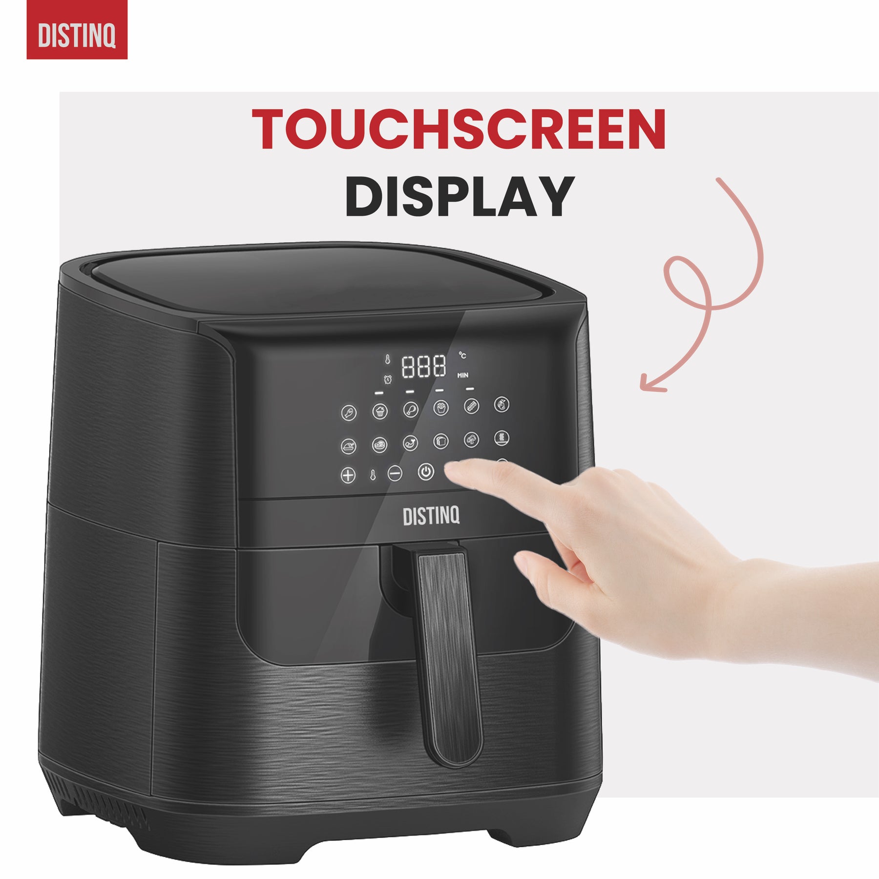 De DistinQ® AirFryer beschikt over een touchscreen-bedieningspaneel en een instelbare tempratuur variërend van 80°C tot 200°C graden. Hierdoor kan je het moeiteloos naar eigen wens instellen en kan je binnen no-time heerlijke gerechten of snacks bereiden. Het was nog nooit zo makkelijke om op een gezonde en toch eenvoudige wijze frietjes of snacks te bereiden.