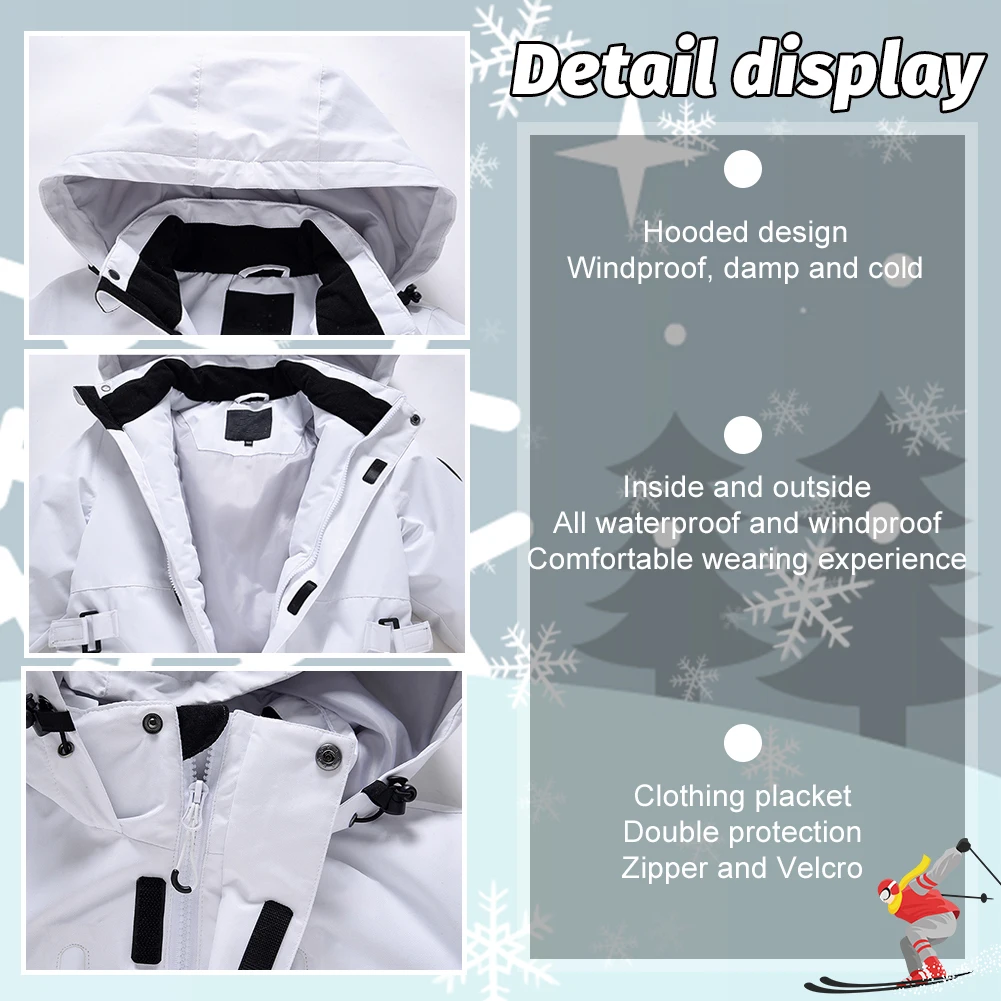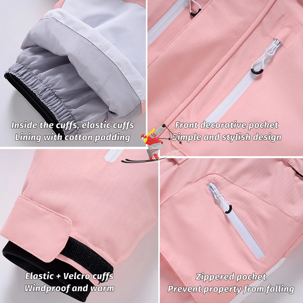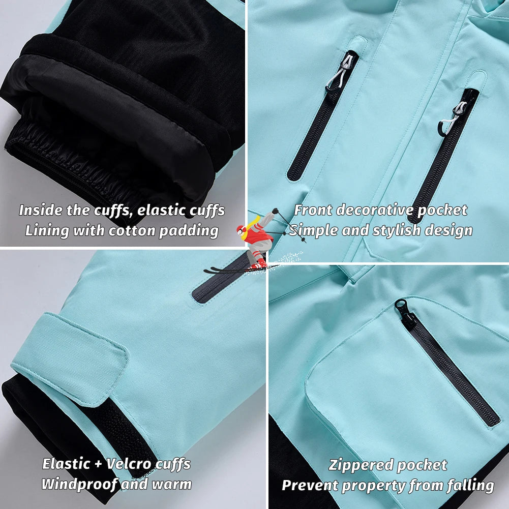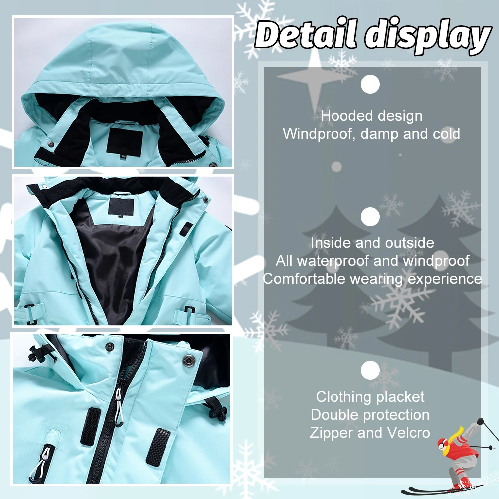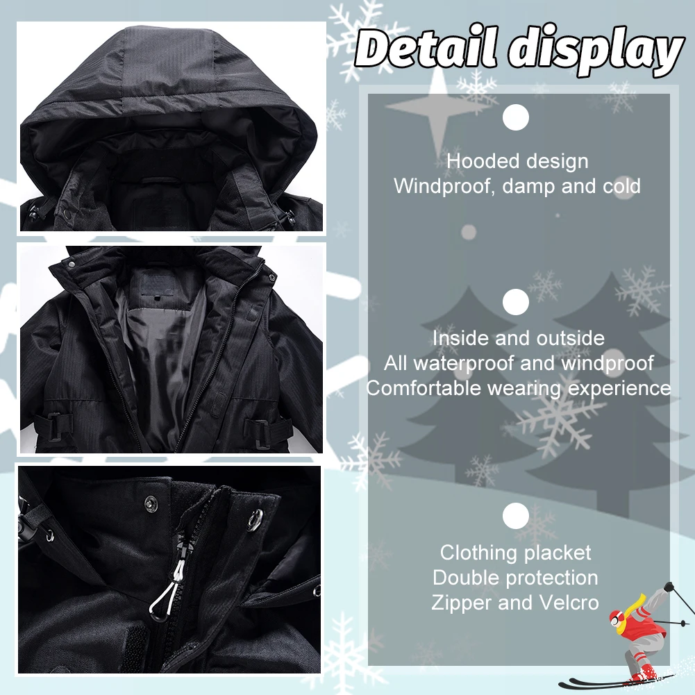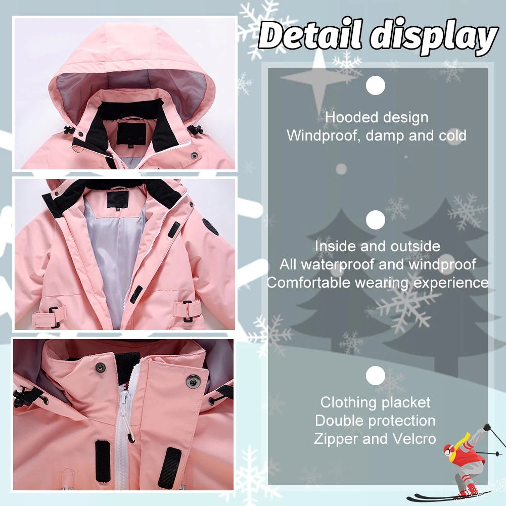 ☃️3.Thoughtful design: the high neck of the children's snowsuit effectively prevents the cold wind from entering the neck, and the waist can be adjusted to better fit the body, while the waist is equipped with a zip, which is convenient for children to put on and take off.