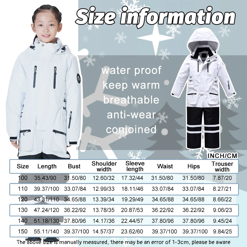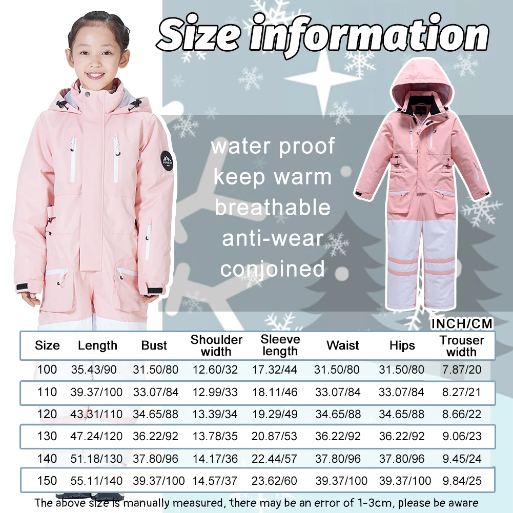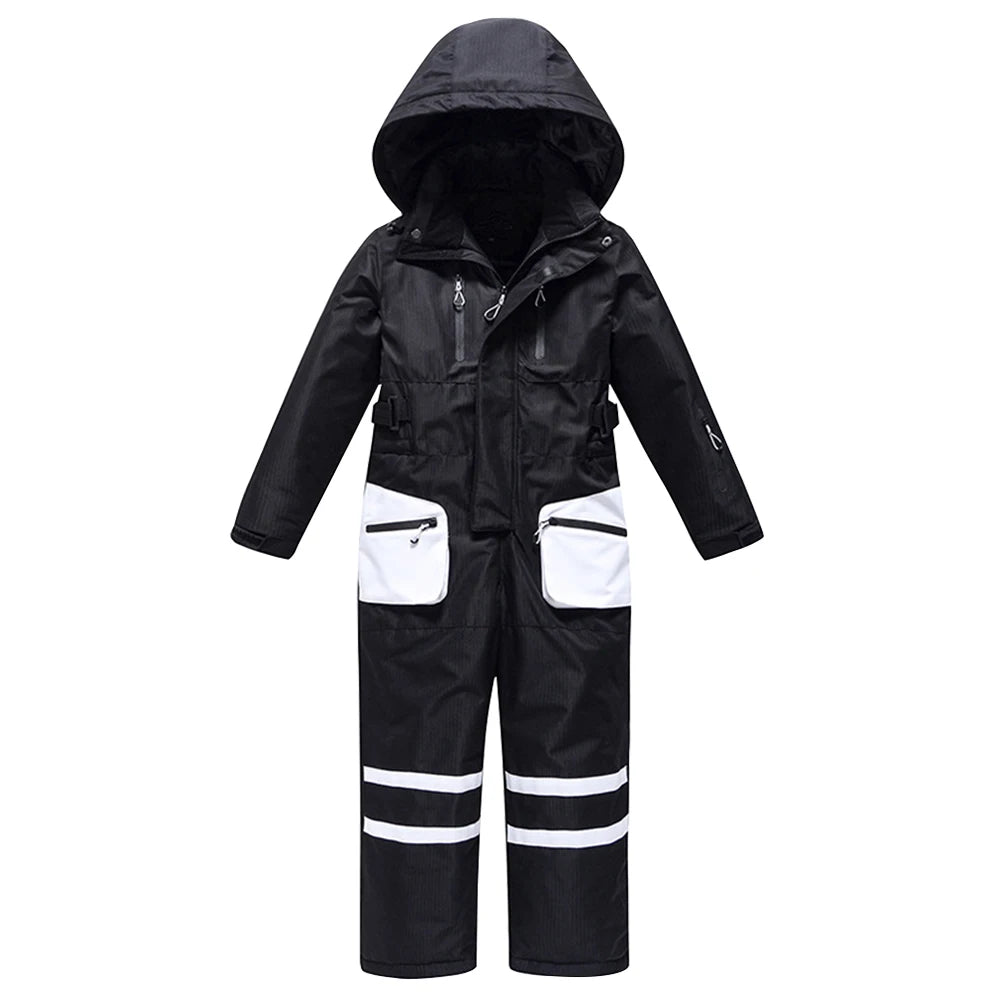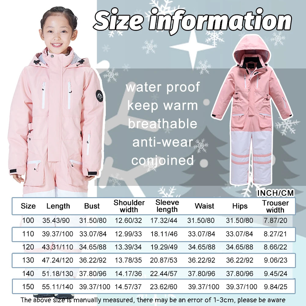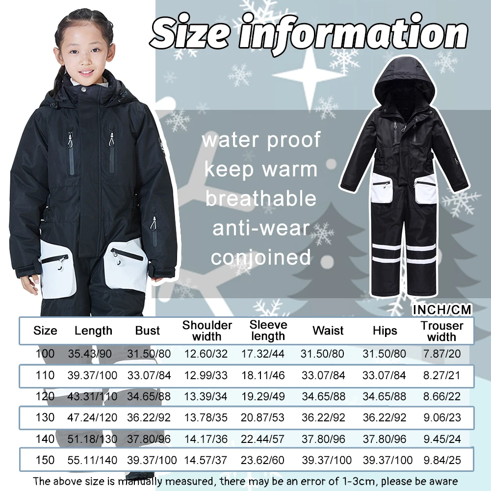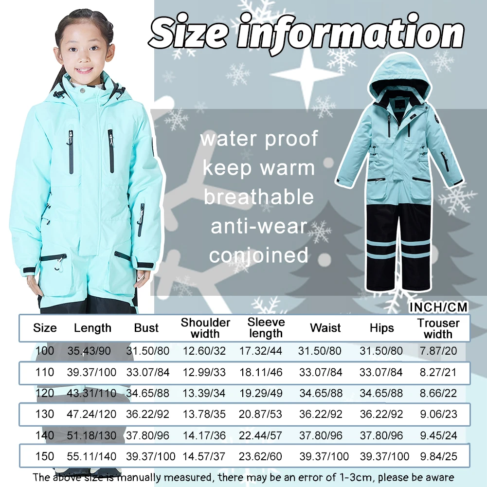 Children's Ski Overalls with Hood Windproof Waterproof Boys Ski Suit Girls Warm One-Piece Snowsuit Kids Winter Snowboarding Wear