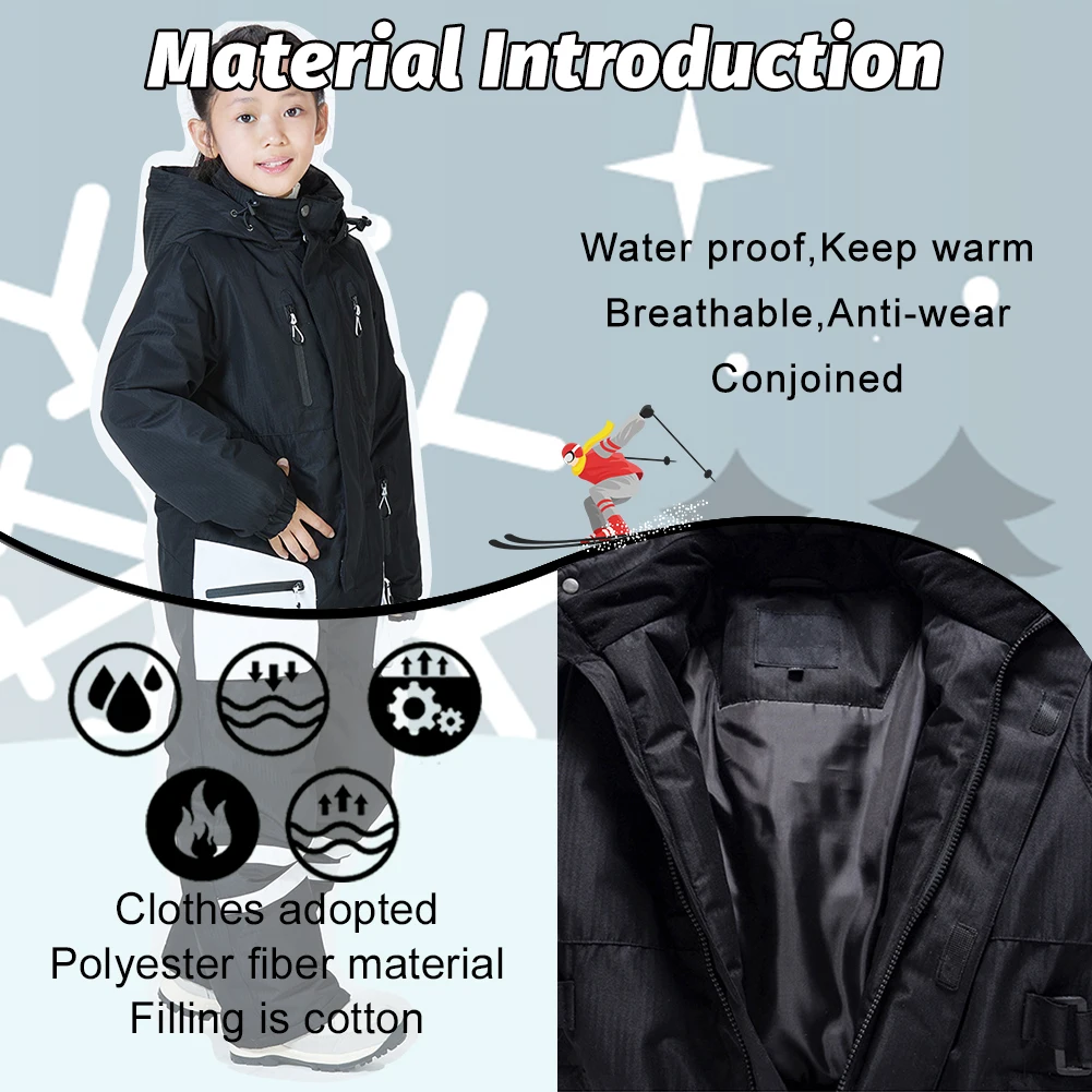 ☃️1.High-quality fabric: the children's ski suit uses polyester fabric, flat and wrinkle-free, easy to clean, windproof and warm, waterproof coating makes it not easy for moisture to penetrate the inside, the lining is soft and skin-friendly, comfortable and breathable.
